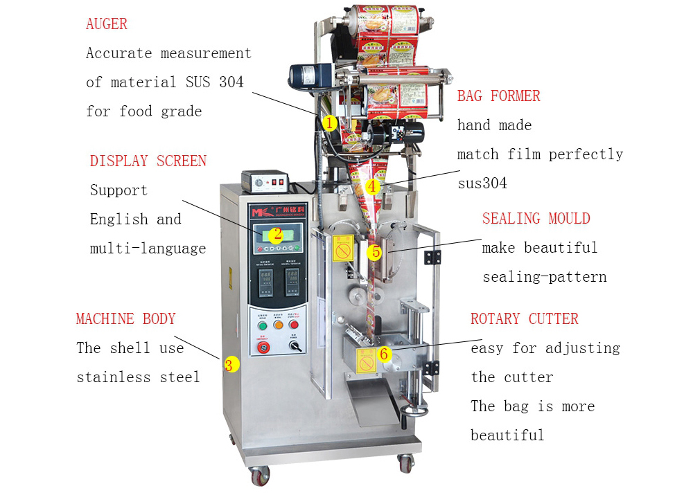 ماكينة التعبئة والتغليف الرأسية، MK-60FZ جُهزت بالميزان الحلزوني للتعبئة الآلية الكاملة المنتجات المطحونة بقياس حجم جسيمات لشبك -100، مثل حليب البودرة ، مسحوق بياض البيض، البن المطحون، الخ. معدة التعبئة والتغليف هذه تنتج أكياس ذات اللحام الثلاثي، أكياس رباعية اللحام، أكياس معلقة بالثقب الدائري، الأظرف الشريطية، الخ.