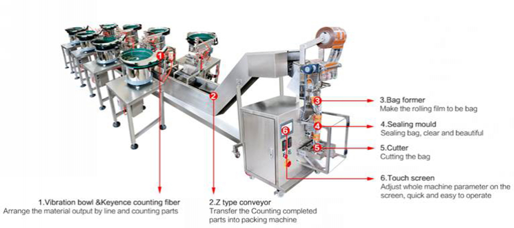 - مغذي وعاء الاهتزاز+المسار الإنزلاقي: مناسب لتعبئة وتغليف البراغي تصل إلى 5 قطع أو أكسسورارت التعليق، باستخدام عددا المتنقل.