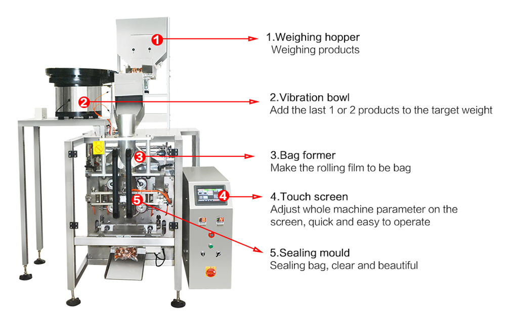 ماكينة تعبئة رأسية وزنية MK-LS-420E صُممت بشكل خاص لتعبئة وتغليف المسامير والبراغي الصلبة. تستخدم هذه الماكينة طريق الوزن المختلط لقدوس الوزن والعد بواسطة وعاء الاهتزاز، الاقدوس يقوم بالوزن وإخراج المنتج قريب من الوزن المستهدف، ومغذي الوعاء الهزاز يستحدم الوزن الثانوي ويضيف من 1 إلى 2 من المنتجات للوصول إلى الوزن المستهدف. وهذا بدوره يضمن دقة الوزن وسرعة التعبئة. وعاء الاهتزاز على شكل V قابل للتطبيق لمجموعة متنوعة من المنتجات، وهذا يجعل للماكينة القابلية الكاملة ويمكنها من أن تحقق التوافق مع متطلبات أغلب مواد التعبئة والتغليف. إضافة إلى ذلك، فإن وعاء الاهتزاز من الداخل تم طلائه بمادة البولي يوريثان PU اللاصقة بهدف التقليل بشكل كبير من مستويات الضوضاء.