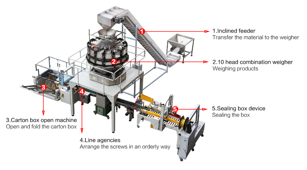 ماكينة تعبئة وزنية MK-LS-AC مجهزت بميزان متعدد الرؤوس، حيث يجعل الماكينة قابلة للتطبيق لتعبئة أكسسوارات التثبيت الصلبة مثل المسامير والبراغي والصواميل، والأجزاء البلاستيكية بكميات كبيرة أو أوزان ثقيلة، الخ.