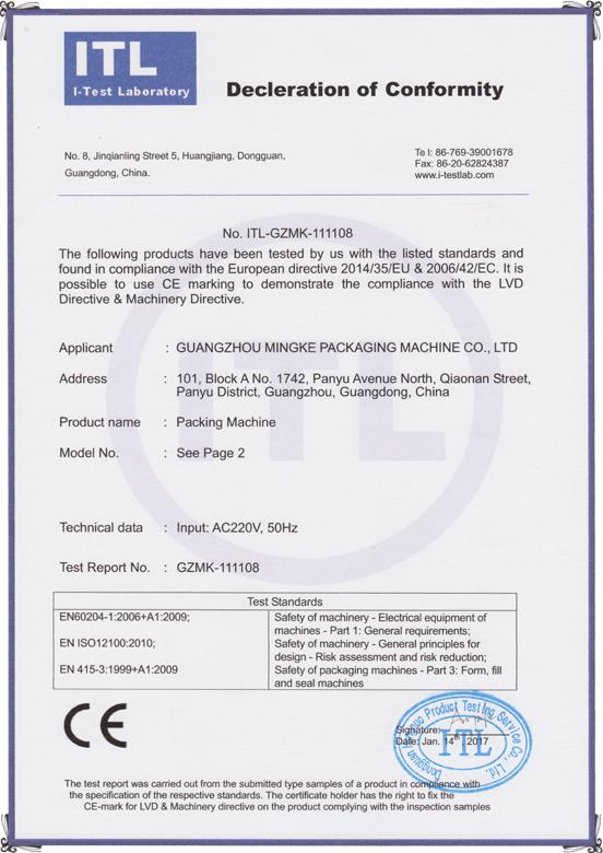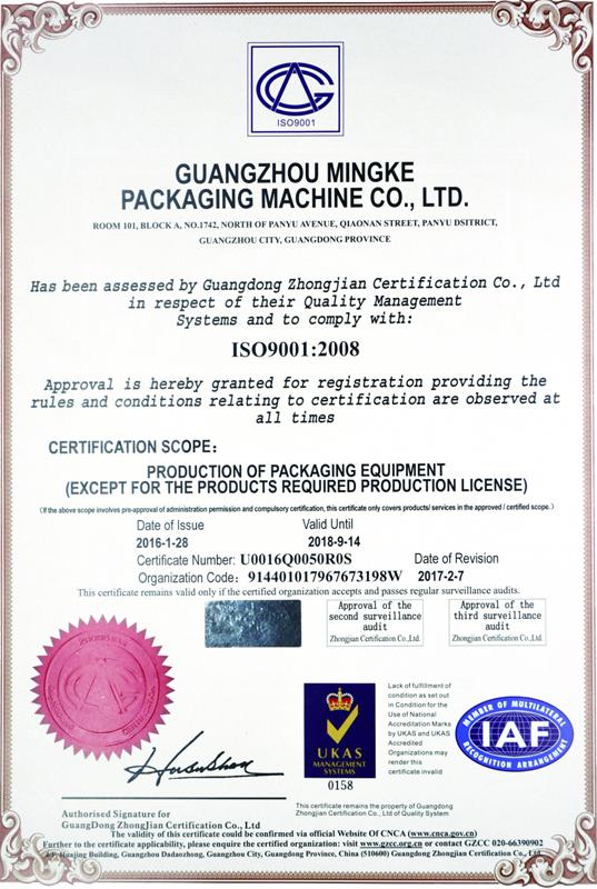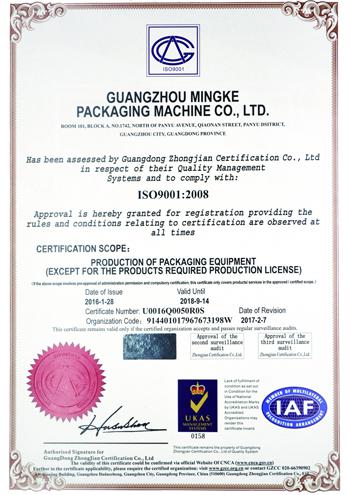 شركة Mingke pack فخورة بتحصلها على شهادة نظام إدارة الجودة ISO 9001:2008وكل منتجاتنا تحصلة على شهادة CE. ماكينة التعبئة والتغليف لشركة Mingke packصدرت إلى أكثر من 100 دولة حول العالم منها أمريكا، كوريا، كولومبيا، سنغفورة، ماليزيا، تايلاند، ألماتياـ أسبانيا، الهند، الخ. إضافة إلى ذلك، نحن أسسنا شراكة طويلة الأمد مع أكثر 500 شركة مثل FLEX، MIDEA، TCL و Samsung’s SAEHAN، وفوزنا بثقة السوق العالمي.